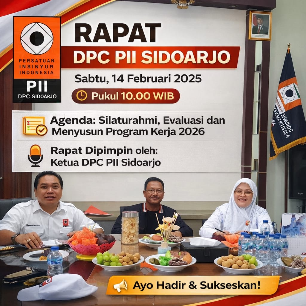 SIDOARJO – Pengurus Cabang (PC) Persatuan Insinyur Indonesia (PII) Kabupaten Sidoarjo menggelar rapat silaturahmi dan evaluasi program kerja, Sabtu (14/2/2025), pukul 10.00 WIB sd selesai.