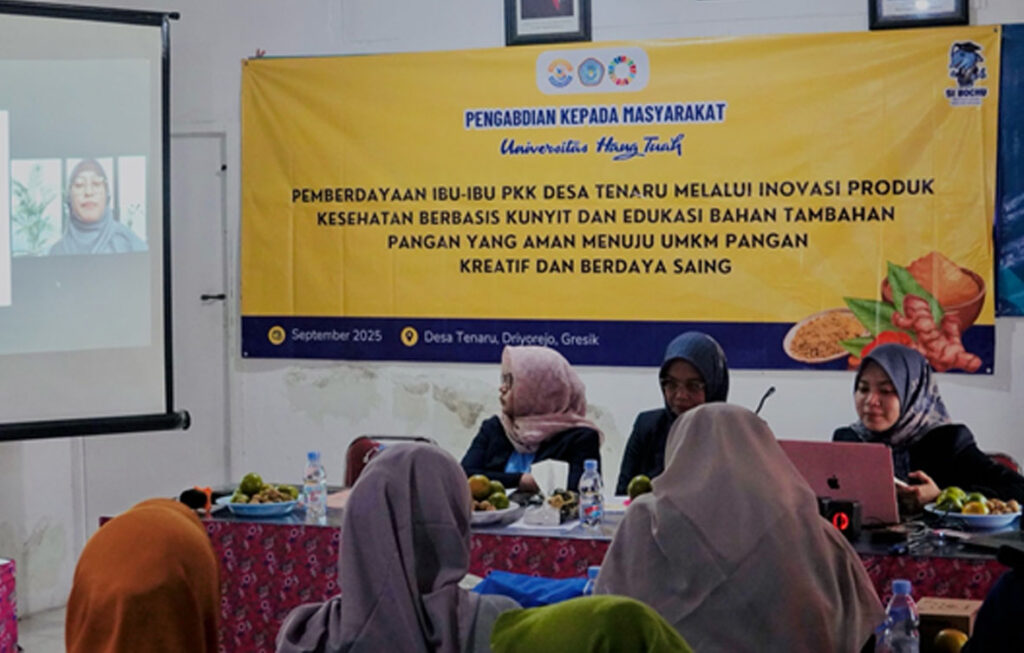Gresik bersatu Gresik, 26 September 2025 – Semangat baru menyala di Balai Desa Tenaru. Puluhan ibu-ibu PKK dengan penuh antusias mengikuti kegiatan Pengabdian kepada Masyarakat (PkM) Universitas Hang Tuah bertajuk “Pemberdayaan melalui Inovasi Produk Kesehatan Berbasis Kunyit serta Edukasi Bahan Tambahan Pangan yang Aman Menuju UMKM Pangan Kreatif dan Berdaya Saing”. Dipimpin oleh Ketua Pelaksana, apt. Ersanda Nurma Praditapuspa, S.Farm., M.Farm., program ini menjadi tonggak kebangkitan UMKM desa agar mampu melangkah lebih percaya diri menembus pasar.